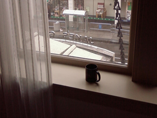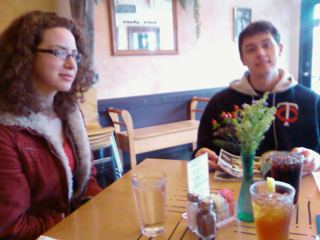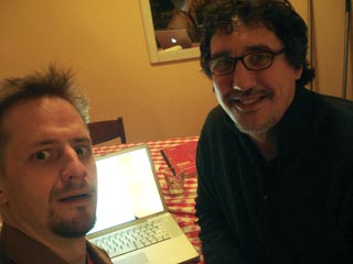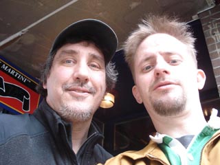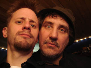 POST FACTUM 10JA09 04:59AM So... Paulie and I were separated. On my bus ride, I sketched out a crap-load of ideas from the initial concept we decided upon on our downtown walk. Paulie, in his cold car waiting for me (unbeknownst of my situation) also wrote up a storm. I don't remember how we finally got back together (I think the mafia and a pixy-sprite were involved). We shoved our material together and discovered that Mr. Neel forgot to include the fifth actor. Hurdle number one. Patched that, but had to sacrifice our main concept. Persevering, we weaved more of what we consider funny into it and may have wounded it with too many esoteric stabs. The real kicker was, after we finished the damn thing, it occurred to me the key relationship change that would make our original concept work in tact. No time for a second draft. In the end we remain no more confident tonight than last. Plus, we are two and a half hours later into the morning. Take heed: do not seek perspective in the blur of creativity at four in the morning. (Our picture shows our turmoil. My God, we've been through a war!) (So proud of our magical non-theater play last night.)
