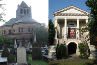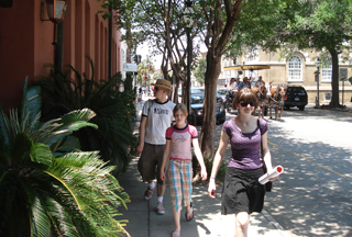 MID FACTUM 25MY08: Charleston is like Bangkok in exactly two ways: property boundaries are flexible and the people are very friendly. Friendly in that they treat boundaries with flexibility, wandering through yards and into buildings as though they are public property. There are so many historic buildings and churches and quaint (there's that word again) alleys and graveyards--so many graveyards--that people must feel that every door may hide a magnificent educational and/or scenic opportunity. It's really neat. On another note: there's a sign on the vent hood at the Waffle house that reads: "After the last customer, put out the flame, and get into the game." The signs at Kinkos weren't as clever, but we had chores there. And a handful of cheerful spectators appeared for the "preview performance" which was cancelled through official channels; luckily the word on the street is stronger than the email. I was questionably prepared in costume and played a handful of songs from the show and a couple from without. Then we chatted for a bit. I promised to buy each and every one of them a drink later in the week. Then, Bronte and I re-staged the show and rehearsed until famished, then wandered the streets in search of Justine's restaurant. Oh, we found it. By this time it was too late to see anything that was on our A-list. We were going to see some improv, but we saw a young woman get hit by a car and then exhaustion brainwashed us to the cineplex where we saw the newest installment of the numbing Indiana Jones. I do love visiting movie theaters on tour. No regrets.