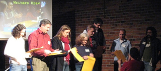 POST FACTUM 11JA09 04:07AM Thanks so much for the compliments, Becky. In many ways the show wasn't what we wrote, but what we wrote wasn't clear begin with, so it's a wash. They kept the essence and it was entertaining as hell. I'm satisfied with that. In general, the evening was a pretty typical, huh? A super-amped wonderfest. I tend to like the odd, low key, risky-writing nights; but I'm thankful of the umpteenth belly laughs tonight that's for sure. Particularly liked Mr. Mullen's and Anita's pieces (hers on both nights!). My first reaction to our piece was joy. Well acted, hysterical cacophony, sexy ladies. They replaced the farce we wrote with a sort of 60's, Peter Sellers, What's New Pussycat type, zany romp. A fun suprise. Then, the more I thought about it, the more disappointed I became that they didn't use the comedy bits we wrote (spent a lot of time on those lazzos). Ultimately, I understand why they went this way and in the end they tell me the cast had a great day. That's most important. I'm glad you think it was a bit demanding. (That means it's art, right.) Whether the whole thing gelled, I'm not sure. What does it matter? It is 14/48! Thanks for reading my blatherings.