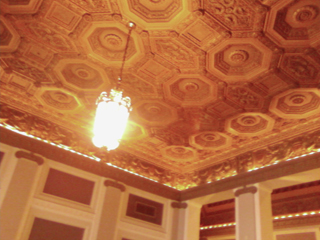 This is a shot is the ceiling of the hotel lobby. It was an historic building and quite confusing -- the elevator went to the lobby, but the stairs led to a restaurant. Perhaps they figured you must be hungry after the walk.