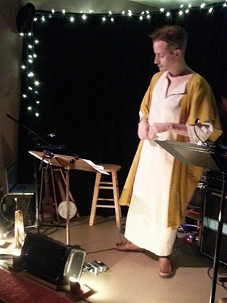 POST FACTUM 26AP14 5PM Where to begin... this event blew the lid off my house! We had close to 80 people sardined in here. (There was room for one third of a person more, by my estimates.) Jennifer said it felt very punk rock, the energy in the room. People wanted to sing sing sing. Perhaps too much, really. But the pathos and intensity bled through, as usual; and the full score worked, didn't get tedious on that little instrument. The guest musicians were the highlight for me, including Joe Zavadil performing Judas' death rant, and the unknown cast of Peter's Denial who spontaneously delivered that song/scene on the fly! Brilliant. I'm excited and glad for this to graduate to a larger venue next year, but I'm glad it could be intimate and special in this way one more time.