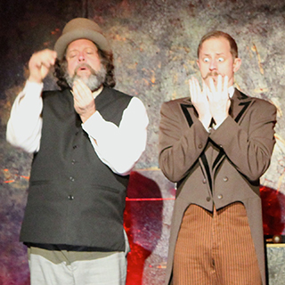 Amusingly, Tim Moore creates the sadistic master Pozzo with a carnivorous tooth-clenching smile, and the plummy imperious, self-dramatizing tones of an old-style Shakespearean. And Mark Fullerton's tall, drooling, skeletal slave, the ill-named Lucky, on his rope leash, is strikingly apocalyptic.
